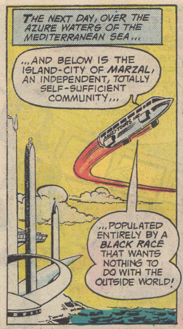 Our introduction to Marzal, “an independent, totally self-sufficient community populated entirely by a Black Race that wants nothing to do with the outside world!”