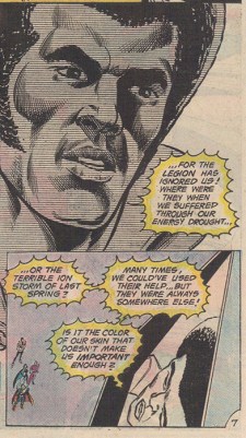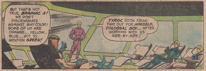 Superboy, Starring the Legion of Super-Heroes #218 reinforces the “color-blind” ideal of issue #216 and adds that Tyroc’s enlightenment came from learning from the Legion’s example.