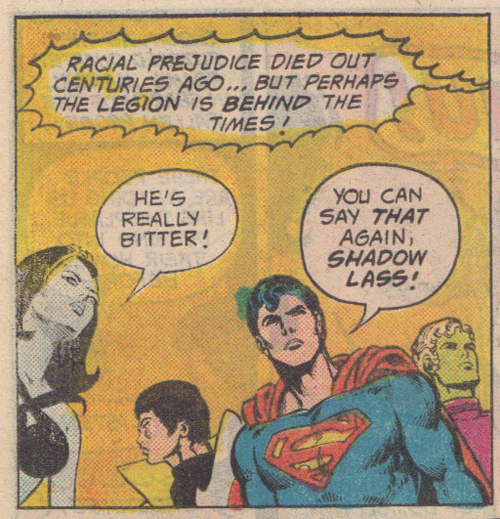 Absorbency Boy’s resentment regarding Tyroc being chosen over him also provides an opportunity to see Legion recruitment through the lens of affirmative action. While the term is not used in the story and there is nothing to suggest that Tyroc gets any special consideration (just the opposite actually), the way Absorbency Boy goes on about Tyroc being chosen over him reminds me of Abigail Fisher’s lawsuit complaining that minority applicants to the University of Texas were chosen over her. The Legion of Super-Heroes reject may never explicitly suggest that race was the deciding factor in his being passed over, but the fact is that Fisher’s lawyers hardly tried to make that argument themselves because it wasn’t true. Instead the case relied on a public perception of this being a referendum on affirmative action and the assumptions that it must mean that Black candidates are getting special treatment over more qualified white applicants.