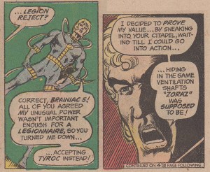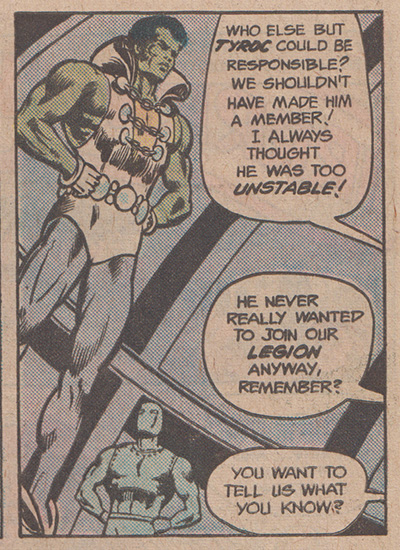 But the entire scenario, and thus Tyroc’s call to heroism, is a charade. The entire premise of Legion membership and their definition of heroism are ones the white teens themselves determine, apparently at their whim. Different creative teams and expectations may explain why Legion candidacy is different from issue to issue but that in some previous stories other applicants simply had to explicate their powers to be invited to join makes Tyroc’s treatment stand out as racialized (especially since his introduction and original exclusion were introduced in racial terms). Like Black Lightning being tested by the JLA in Justice League of America #173, the form of Tyroc’s testing is anomalous and discussed by the white majority in racial terms.