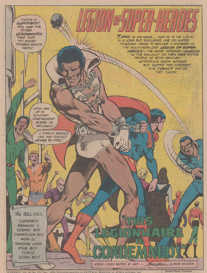 The Legion of Superheroes is a teen team comic book built partially on the possibility of young readerly engagement imagining oneself as a potential member. The kid’s clubhouse feel of their adventures plus the reinforcement of meritocratic ideals through their enrollment ritual of evaluating any superpowered teen for membership encourages that kind of wish fulfillment reading. However, what that Legion evaluation consists of depends on the creative team, the era, and the narrative demands of the particular story. Nevertheless, when the Legion is faced with a foe beyond their power to defeat in Superboy, Starring the Legion of Superheroes #218 (July 1976) and Tyroc is their only hope to defeat it, the scenario turns out to be an elaborate hoax to test the only Black would-be member.
