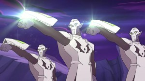 Figure 2. Three clones of Horde Prime raise their weapons, looking identical and visually coded as masculine. “Heart: Part 1,” She-Ra and the Princesses of Power (Netflix: May 15, 2020).