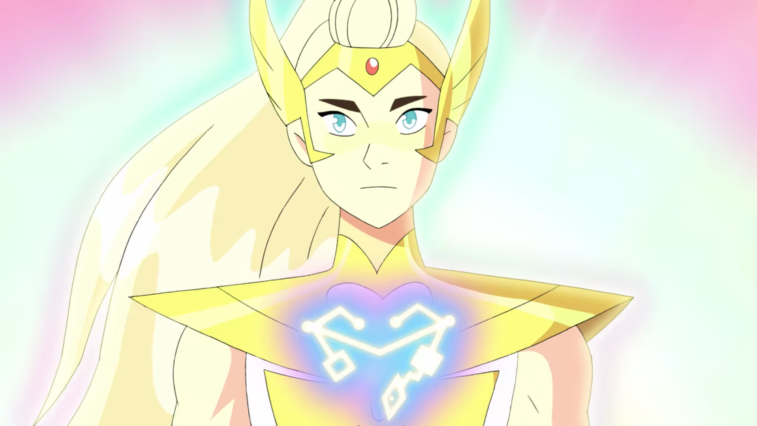 Adora steps onto the battlefield in her new She-Ra form, the fail-safe now glowing in her chest. “Heart: Part 2,” She-Ra and the Princesses of Power (Netflix: May 15, 2020).