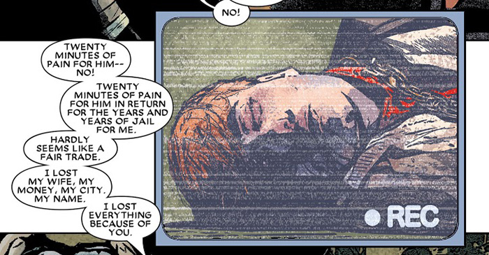 “Daredevil being videotaped while lying in the street, bloody and unconscious and trussed up in chains after being roughed up by Gladiator” (from Daredevil vol. 2, #67 [January 2005] – by Bendis, Maleev, Stewart, and Petit)