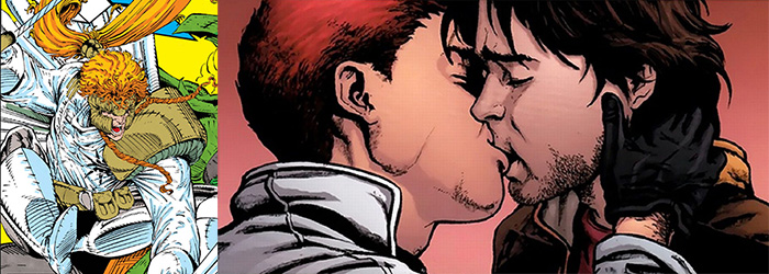 Shatterstar in an early appearance drawn by Rob Liefeld (1992) and Shatterstar and Rictor’s first kiss in X-Factor vol. 3, #45 (2009) by too many artists to list.