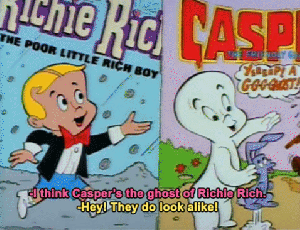 Bear with me for a second: Many folks are familiar with Lisa and Bart Simpson’s theory regarding the relationship of Richie Rich to Casper. The Simpsons episode, “Three Men and a Comic” (1991) features Bart speculating that since Richie Rich and Casper kind of look alike, it might be possible that Casper is actually Richie’s ghost. When Bart wonders aloud how Richie died, Lisa responds “Perhaps he realized how hollow the pursuit of money really is and took his own life.”