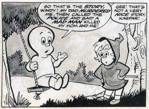 Casper’s relationship to death and Richie’s desire to be a part of the fantasy world Casper occupies suggests to me that the latter’s desire for escape from a commodified existence manifests as the death-urge, wondering like Hamlet, “what dreams may come?” Casper represents a potentially better future for the “poor little rich kid.”