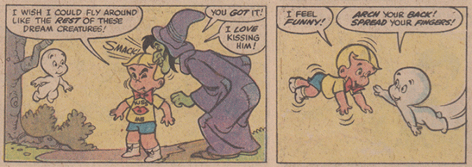 And this pursuit is something Richie follows up on, after fixing some of the objects the inhabitants of the Enchanted Forest got by trading with Tim, he asks aloud, “If I’m dreaming why do I have to be so scientific and realistic?” and then wishes he could fly “like the rest of the dream creatures.” Wendy’s Aunt Zelma the witch responds to this by giving him a kiss on the head to grant his wish as a thank you for fixing her new electric frying pan (she traded her cauldron for it) but also because, as she explains, “I love kissing him!” When Richie says, “I feel funny!” as he begins to rise into the air, the “funny feeling” of the non-normative experiences he is having clearly give him unabashed delight! Though he is eventually a little abashed because Zelma isn’t the only one who loves kissing him. When the spell expires, Richie goes tumbling into the sea, where a bunch of frisky literate fish take his t-shirt as permission to start kissing him because he is “cute.” They end up pursuing him to a cave where he climbs out of the water to escape, peeling off his wet t-shirt in the process. This is how he arrives at the Castle of Strange Things, not that the order of events matters too much. What matters to me is Richie’s desire for freedom and his uncertainty when it comes to others’ desire to kiss him, objecting to the lack of consent. Casper never offers a smooch, so we can’t know how the kid would react to that but my guess is some variation on “I feel funny!”