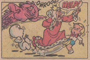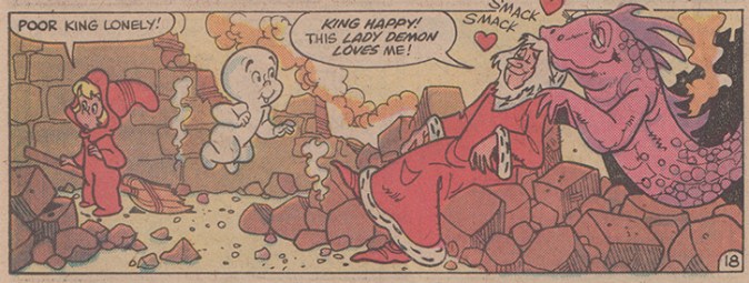 King Lonely is the ruler of the Castle of Strange Things but manages to avoid Trader Tim’s persuasive power with a little help from Richie who counsels the monarch to cover his ears. Despite his castle being destroyed, King Lonely gives in to the demoness’s desire and we last see him amid the ruins, announcing he has changed his name to “King Happy” now that a “Lady Demon loves me.” Up to this point, the appearance of the horny demon seemed like the storyworld’s reliance on the latency of child sexuality to present the possibility of that sexuality as something to be scared of. At the same time, the sense of mystery that exists at latency’s bounds, adds to the frisson of Richie and Casper’s relationship, capturing the complex and interlaced strands of peril and pleasure that come along with growing up and coming to learn about the contexts of our desires (or lack thereof).