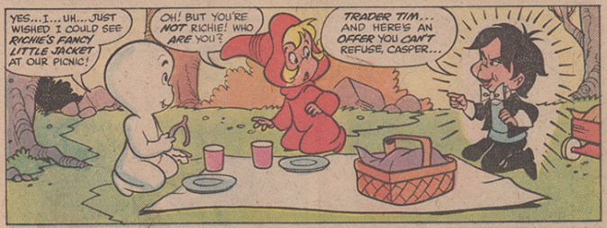 Trader Tim appears in the Enchanted Forest where Casper and Wendy are having a picnic (do ghosts eat?) and the former has just used a wishbone to wish he “could see Richie’s fancy little jacket.” Since Tim is now wearing the jacket, he appears with it. And he immediately gets to trading, getting the actual wish-granting wishbone in return for a faulty slingshot and then trading a malfunctioning vacuum cleaner to get Wendy’s flying broom. This is followed by a careless brag by Tim “wishing” Wendy and Casper could see the t-shirt he’d traded for Richie’s jacket, which makes the kid billionaire appear.