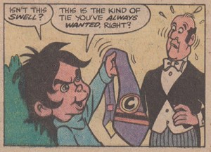 Cadbury trades his bow tie for a broad gaudy tie emblazoned with a “C” and reminiscent of the wide kipper ties popular in the 1960s and into the 70s. Richie is convinced to give up the tuxedo jacket he is always wearing for a yellow novelty t-shirt emblazoned with big lips and “Kiss Me.” As the two characters realize they may have been hypnotized, Trader Tim disappears into thin air and the comic narrative moves into a dream-space more explicitly.