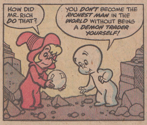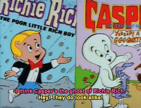 Bear with me for a second: Many folks are familiar with Lisa and Bart Simpson’s theory regarding the relationship of Richie Rich to Casper. The Simpsons episode, “Three Men and a Comic” (1991) features Bart speculating that since Richie Rich and Casper kind of look alike, it might be possible that Casper is actually Richie’s ghost. When Bart wonders aloud how Richie died, Lisa responds “Perhaps he realized how hollow the pursuit of money really is and took his own life.”