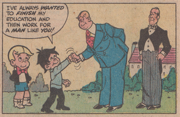 In the end, Trader Tim wishes he were back meeting Richie Rich for the first time in order to get a chance to do it all over and not lose everything—his truck with all his accumulated loot (except for the wishbone) was crushed under the collapsing castle. (To ask, “Why couldn’t he simply wish for all his stuff back?” would be a failure to accept the dream-logic of the whole adventure.) And so, we are back to the beginning, but this time as Trader Tim goes to trade for Cadbury’s tie, Richie’s father arrives to intervene. When Richie tries to warn his father about Trader Tim’s power to “trade the spots off a leopard,” explaining that he knows this because of a strange dream he had, Mr. Rich scoffs. It turns out being an uber-rich capitalist comes with its own powers because not only does Mr. Rich decline Tim’s swirly eyed request to trade businesses, he makes a counteroffer trading Tim’s “willingness to learn and work” for a job in Rich’s office, but only after Tim finishes his education. Tim sputters but takes the deal, claiming, “I’ve always wanted to finish my education and then work for a man like you!”