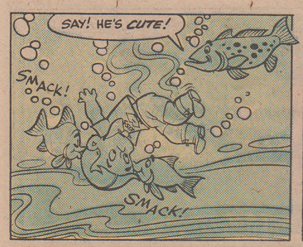 And this pursuit is something Richie follows up on, after fixing some of the objects the inhabitants of the Enchanted Forest got by trading with Tim, he asks aloud, “If I’m dreaming why do I have to be so scientific and realistic?” and then wishes he could fly “like the rest of the dream creatures.” Wendy’s Aunt Zelma the witch responds to this by giving him a kiss on the head to grant his wish as a thank you for fixing her new electric frying pan (she traded her cauldron for it) but also because, as she explains, “I love kissing him!” When Richie says, “I feel funny!” as he begins to rise into the air, the “funny feeling” of the non-normative experiences he is having clearly give him unabashed delight! Though he is eventually a little abashed because Zelma isn’t the only one who loves kissing him. When the spell expires, Richie goes tumbling into the sea, where a bunch of frisky literate fish take his t-shirt as permission to start kissing him because he is “cute.” They end up pursuing him to a cave where he climbs out of the water to escape, peeling off his wet t-shirt in the process. This is how he arrives at the Castle of Strange Things, not that the order of events matters too much. What matters to me is Richie’s desire for freedom and his uncertainty when it comes to others’ desire to kiss him, objecting to the lack of consent. Casper never offers a smooch, so we can’t know how the kid would react to that but my guess is some variation on “I feel funny!”
