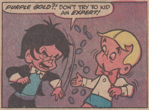 I have spent a lot of time examining the queer tensions notable in the relationship of Richie Rich and the freedom of his dream world, but I think there is also an interesting, if not fully coherent, critique of capitalism in this comic, too. From the “purple gold” that disrupts the notion of precious metals and the historical basis for economic systems to Tim’s insistence that “I don’t sell anything! I just swap!” the story, while far from echoing Das Kapital, nevertheless raises questions about the fairness of economic exchange and places Mr. Rich in the same category as the child huckster trading things you don’t really want and definitely don’t need to fulfill manufactured desire that moves us away from freedom.