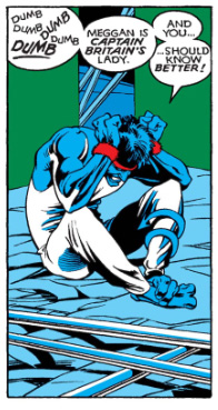 I have a hard time believing I didn’t see these consent issues the first time I read the comic. It’s obvious the characters aren’t meant to be perfect. They’re clearly flawed and confused, just like real people when they’re feeling lonely or lustful—like when they’ve been single for a long time, or their partner’s been a jerk lately, and their very amenable, very attractive friend is right there, wearing a string bikini or a pair of very tight, very white pants. The inappropriateness of Kurt’s behavior is particularly emphasized. After the rest of the team arrives home and Meggan flies off in a panic, Kurt is given a dedicated panel in which to angrily berate himself. He does so while contracting his body into a tellingly tense and protective pose, holding his head in his clenched fists while his unique feet fold together and his tail makes two tight coils around his calf. Visually, this conveys sexual shame. Yet Kurt’s dialogue suggests he doesn’t fully understand why his actions were wrong and leaves it up to the reader to decide whether Claremont and Davis know better. According to Kurt, tickling Meggan wasn’t wrong in a general sense, but rather because she is “Captain Britain’s lady.” In other words, tickling Meggan without her consent was only wrong because Meggan “belongs” to another man. In effect, Kurt sees himself as betraying Captain Britain’s trust, rather than Meggan’s.