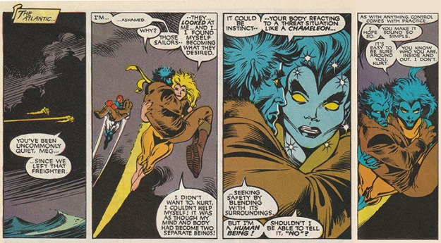 Kurt’s tickling is definitely problematic. So is Meggan’s agency being expressed by having her transform into a version of a male character, perhaps in response to his desire. But for me, it matters that Meggan mirrors this specific man. As long as I’ve been in love with Kurt Wagner, I’ve wanted to both have him and be him. I always feel this way about my favorite male superheroes, in part because they possess a sexual agency most female superheroes don’t. Precisely because their erotic appeal isn’t prioritized, male superheroes get to be simultaneously sexy and powerful. They can strut around symbolically naked while never being shamed or diminished for their exhibitionism, never made to feel “less than” or slutty just because they choose to show off their curves—and enjoy doing so. You think Superman wears that impossibly tight spandex to cut down on wind resistance? I say it’s because he likes the way the wind feels on his nearly naked skin when he’s breaking the sound barrier. (I bet it feels good.) Nightcrawler’s especially visible, especially fantastical difference makes him an especially appealing site of erotic affiliation. Even though Nightcrawler, like other male superheroes, is rarely presented as an erotic spectacle the same way a female character like Meggan is, his body is inherently gender fluid, every masculine characteristic paired with a connotatively feminine counterpoint. His power is conveyed through acrobatic flexibility, his vampire fangs are domesticated by his iconic smile, and his tail both thrusts and squeezes, coiling around his own body or the hilts of swords, but also, sometimes, around the waist or thigh of a friend or lover. I’ve also thought entirely too much about the fact that Kurt’s hardbody is literally soft, all those taut muscles coated by a thin layer of fur that, canonically, approximates the texture of velvet. (I bet that feels better than good.) Other stories in other genres and mediums have imagined comparable men. But for me, there’s a special subversive charge to this hybrid body in this space, because it proves superhero comics don’t have to be simply sexist, and aren’t, in part because they’re comics, which are always similarly hybrid.