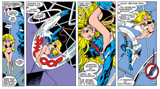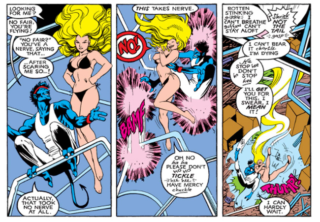 I’m something of an expert on this, so I feel pretty confident saying—this is a very sexy Nightcrawler scene. In case you need convincing, let me walk you through my read of it, a little over a decade ago. In this scene, Kurt is fun and adventurous, like all the best swashbucklers (who’ve always had my number) but with a vulnerability and self awareness Errol Flynn never had. Following some playful back-and-forth and an exchange of glittering smiles, Kurt, a former trapeze artist, literally sweeps Meggan off her feet and tosses her into his aerial jungle-gym, intending to show off his strength and skill by catching her in mid-air. Meggan, however, subverts his macho performance by choosing to fly instead of falling into his arms. Despite Kurt’s professed fantasies about rescuing damsels in distress, he’s not turned off by Meggan’s show of strength. Instead, he’s encouraged by it. He grins before risking a teleport to tickle her, employing his hands and his tail. This reduces Meggan to breathless laughter, which makes both characters fall, all the way from the high ceiling to the floor.