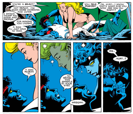 Consent and agency are further complicated by the conceit of superpowers. Physically, Meggan is far more powerful than Kurt. This discrepancy is compounded by Kurt’s current disability; in previous issues, single teleports have left him so weak, he’s struggled to walk without assistance. Yet previous issues have also depicted Meggan with less-than-total control over her empathic shapeshifting. She becomes more childlike and animalistic when she’s upset or insecure and becomes larger and stronger when she’s angry. In Excalibur #6 (March 1989), she directly tells Kurt she can’t always control herself; her shapeshifting is partly instinctual. Meggan is rendered additionally vulnerable through her rocky relationship with Captain Britain. Kurt knows about these relationship issues. Indeed, he is, at this point in the story, the only member of the team who seems aware of Captain Britain’s troubling behavior toward Meggan, which looks a lot like emotional abuse. Perhaps Kurt is identifying Meggan’s vulnerabilities, and exploiting them, embodying the worst version of the “Dogged Nice Guy” trope. Then again, Meggan’s ability to know and embody someone’s deepest desires is a truly staggering power; whether consciously or unconsciously, she could be playing with Kurt’s emotions as much as he’s playing with hers. In addition, the emotional intelligence that helps Kurt perceive Meggan’s mistreatment is one of the things I like best about him, knowledge I brought with me as an experienced reader of this serialized story. Maybe Meggan likes this, too. Maybe that’s why she wants to be with Kurt—or become him.