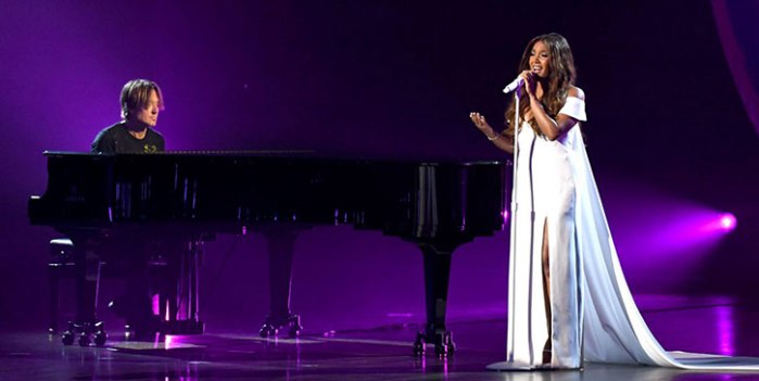 Keith Urban and Mickey Guyton perform during the Academy of Country Music Awards at the Grand Ole Opry on September 16, 2020. Image by Kevin Mazur.