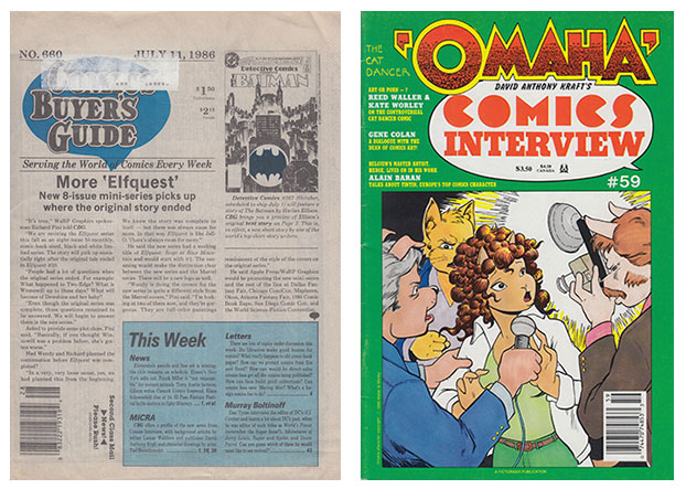 Comics Buyer’s Guide #660 (July 11, 1986), which features a letter about the early years of the MSU comics archive from legendary curator Randy Scott, and Reed Waller and Kate Worley’s Omaha cover for David Anthony Kraft’s Comics Interview #59 (1988).