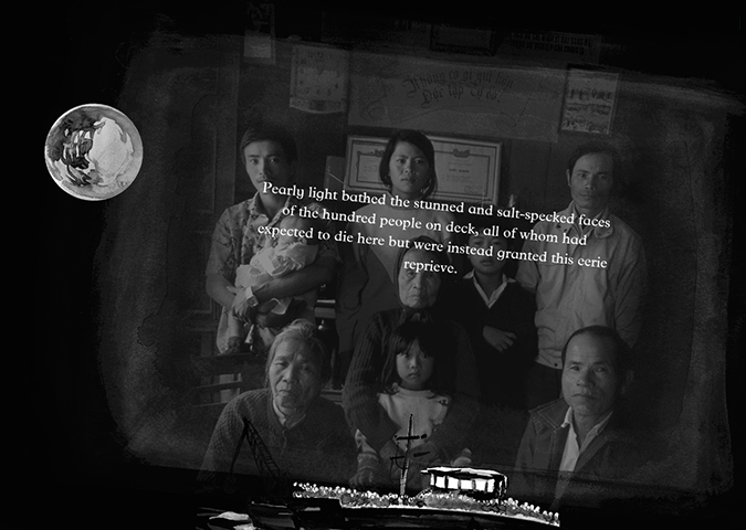 Huynh’s decision to work with Le’s source text stems in part from their similar background and their approach to art as a form of advocacy: their families were part of the Vietnamese-Australian diaspora in the late 1970s, and both artists have used their art to highlight the physical and political vulnerability of refugees and persecuted minorities. In particular, Huynh notes on his website that his adaptation of “The Boat” was released in time to mark “40 years of Vietnamese resettlement in Australia,” locating the project as both a piece commemorating the refugees themselves and as a critical challenge to the problematic history of Australian resettlement policies.
