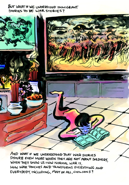 This intense concentration on particularity—particular lives and experiences—means that the space of the boat and the bodies of Mai, Truong, and the other refugees become the central focus rather than political or legal issues related to asylum claims. It’s one approach among many to make refugee narratives visible, as Huynh’s own body of work demonstrates. For example, his 2018 illustrated adaptation of Nguyen’s “On True War Stories” for the Massachusetts Review contains much more specificity than “The Boat.” It concentrates on Vietnamese refugees who do make it to places such as San Jose, California, only to continue to face the ramifications of war. Nguyen describes a war that doesn’t have soldiers but in which daily violence such as exploitative work conditions, loss of family back in Vietnam, and racism and discrimination have become normalized. In that text (and more clearly outlined in Nguyen’s original piece), Americans like the ones who read literary magazines such as the Massachusetts Review are the ones who wage war against the refugees by not facing the uncomfortable truth of how war stories are thrilling and entertaining but often end up erasing the lives of immigrants displaced by conflict because they focus instead on soldiers and battles.