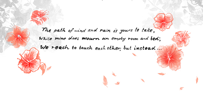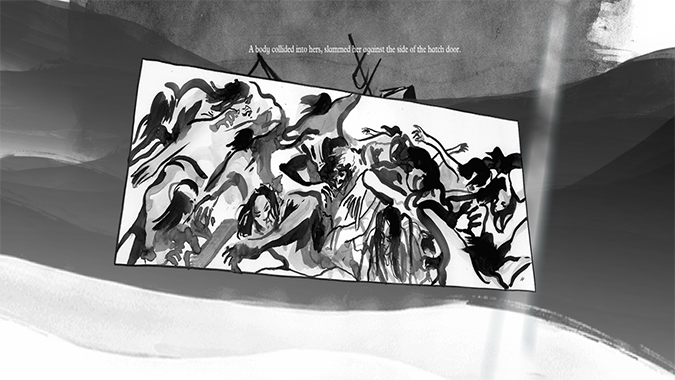 The foundation of “The Boat” involves panels drawn in a rich sumi-e, ink brush painting style in tandem with multimodal forms such as animation, sound, photos, and text to create a version of the story that focuses on sensorial immersion. Panels are actually animated and show the refugees in the over-packed hold of the boat, slammed around the phone or computer screen by the storm. The sinuous black lines in each panel emphasize the tangle of limbs and the forced intimacy of these circumstances. In another section, the sound of a haunting war song about waiting and loss emerges from the speakers to echo against a tableau of hibiscus flowers. Sometimes, the text breaks away and falls off the screen entirely, not even recoverable by returning to that point in the story. In all of these examples, the digital comic is augmented by other haptic and sensory strategies such as sound and animation.