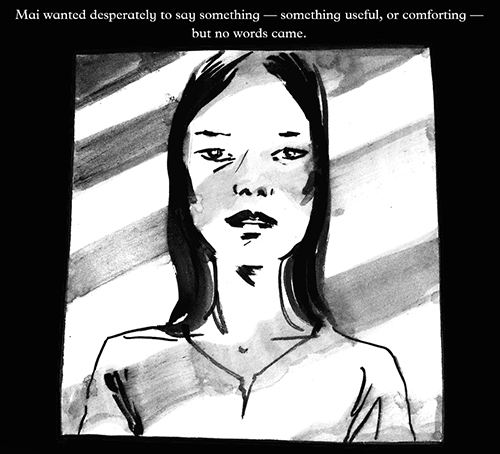 Huynh uses these visual and participatory strategies to challenge the idea of distance between the content and the reader. If the reader is engaged not just in reading the story but in constructing it, it can upend how we interact with the work as a whole and make reading a perplexing experience. We don’t just read Mai’s story–we actively shape how Mai experiences her journey to Australia and to safety. In an interview with Kaya Press, Huynh talks about his career’s consistent emphasis on “entic[ing] audiences in surprising, novel, and challenging ways to empathize with characters and values that might not otherwise have a voice.” This element becomes crucial given how Huynh’s artwork renders the vulnerability of Mai’s and Truong’s young age. Though Mai is clearly an active agent on the boat itself, ultimately she and Truong are children undergoing a dangerous journey with only one adult (who is also quite young herself) to support them. The situation provokes the uncomfortable feeling that we as readers are responsible in some way for caring for Mai and Truong while simultaneously thrusting them into danger.