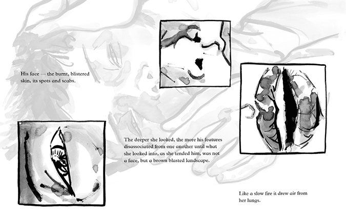 Similar to Nijdam and Ahmed, Huynh’s adaptation considers the dynamic relationship between creator, text, and reader, including one notable example at the end of “The Boat.” While the story focuses on Mai, she quickly becomes friends with Quyen, a woman who’s not much older than Mai, and Quyen’s young son Truong. They offer advice and care for each other throughout the hardships at sea. Near the end of “The Boat,” Truong dies from a sickness caused by a combination of heat, starvation, and dehydration. Mai looks away as Truong’s body is thrown overboard, just after the moment when they finally sight land. Unlike Mai, we as readers are not permitted to look away, as Huynh draws several panels successively following Truong’s body as it hits the water and then disappears underneath.