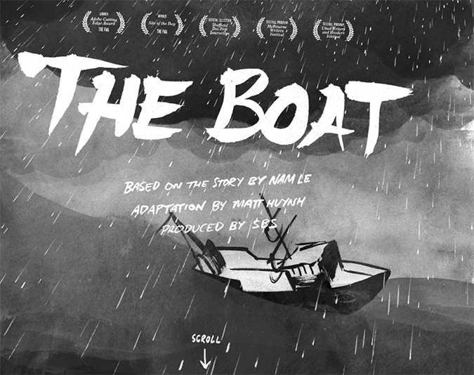I found one example in the work of Matt Huynh, a Vietnamese-Australian visual artist. In 2015, Huynh illustrated a digital comic adaptation of Nam Le’s short story “The Boat” from 2008, produced by Kylie Bolton and the Australian broadcast company SBS, with project development by Matt Smith and sound design by Sam Petty. The story follows 16-year-old Mai as she is put on a boat by her mother to seek safety after the fall of Saigon. She meets Quyen, a young mother fleeing the Communists, and Truong, Quyen’s six-year-old son; together, they experience a storm, a damaged vessel, and severe hunger and thirst before eventually reaching the shores of Australia.