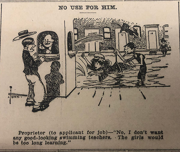 Frink turns a harness used for swimming lessons into a joke that both acknowledges female sexual desire, and acknowledges men as objects of sexual desire. (9/2/1903, Chicago Daily News) [Click to Enlarge]