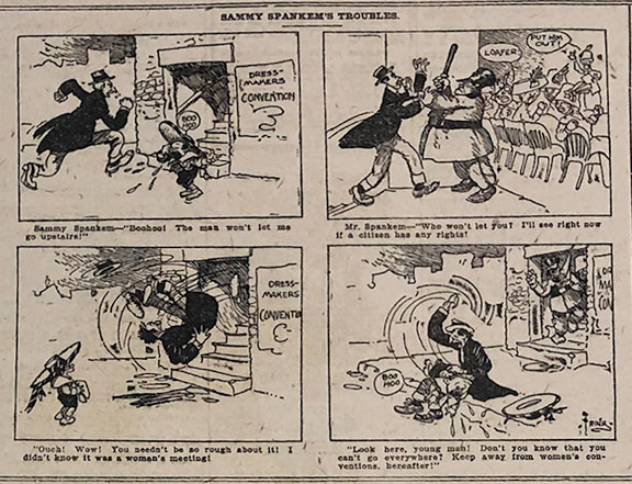 Mr. Spanker is called a “loafer,” an insult used for morally dubious characters often associated with homosexual relatioins, for entering a women’s convention. (5/15/1909, Chicago Daily News) [Click to Enlarge]