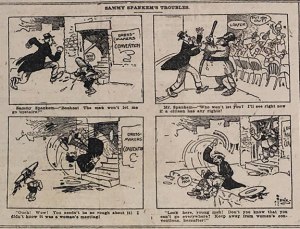 Frink’s regular strips often relied on similarly sexualized scenarios that played with power and masculinity. Sammy Spankem features a boy that comics historian Allan Holtz aptly describes as a “nancy-boy type kid” who in each strip tattles to his father (yet another dead-ringer for Frink’s self-caricature) about a problem, only for the father to find out he misunderstood the situation altogether. The May 15, 1909 strip makes a shockingly direct allusion to homosexuality. After young Sammy complains to his father that he “isn’t allowed upstairs” in a building, Mr. Spankem barges into a dressmaker’s conference full of women who scream “Loafer!” at him and sic the cops on the apparent gender transgressor. The term “loafer” means, according to Richard H. Thorton’s An American Glossary: Being an Attempt to Illustrate Certain Americanisms upon Historical Principles (1912), being a kind of roguish layabout who “troubles himself about other men’s business” and who “is a lounger about places of…amusements” (547). While used to describe a range of deviant behaviors, the term often encapsulated sexual activity that fell outside the bounds of accepted heterosexual practice. The 1915 International Record of Medical Practice, for example, claims the “habitual young corner loafer with all day on his hands soon becomes as depraved as his older and more hardened associates,” and makes it plain that the source of this depravity is “the practice of sodomy” and “other forms of irregular intercourse.” By wandering unknowingly into a space reserved for women, Mr. Spankem has transgressed an important boundary of gendered space, and has been labeled according to his transgression by the straight world around him.