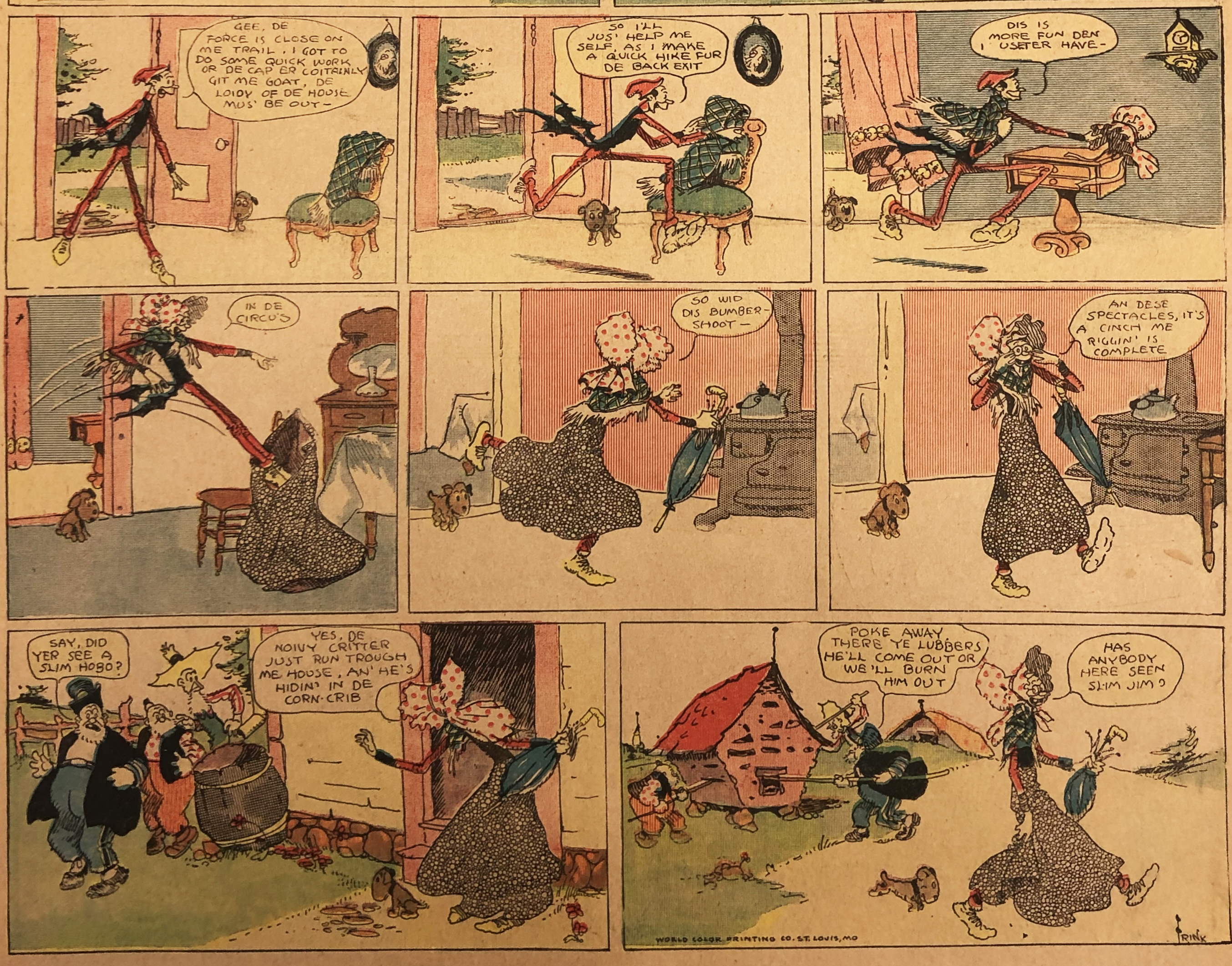 Circus Solly also foreshadows the emergence of the animated chase scene with the gag-filled adventures of its eponymous protagonist (called “Slim Jim” in later strips to avoid copyright issues). A homeless ex-acrobat, Solly is constantly and inexplicably pursued by a group of proto-Elmer Fudd plainclothes thugs with a shaky claim to being policemen. The strip was syndicated in rural areas throughout the Midwest from 1901 until 1932 (by two other cartoonists after 1915). This is the same time and place when and where many of the hotshots of industrial animation (like Friz Freleng and Walt Disney) were born, raised, and sharpening their understandings of cartooning on the whetstone of the newspaper comics. Solly’s crimes that inspired the never-ending chase are never clearly or consistently specified—the Grassville Force seems compelled to chase Solly simply because it is their role in a cyclical game of pursuit that is designed to last forever. The only goal of the endless chase—like Bugs Bunny and Elmer Fudd to follow—is to provide pleasure for those who watch it unfold.