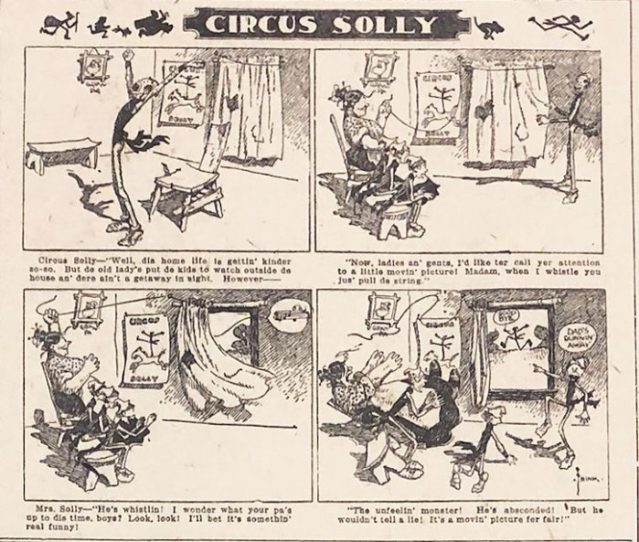 By pretending to be a moving picture show, Solly not only prefigures animation: he uses it as a vehicle of escape from his wife. (10/3/1905, Chicago Daily News)