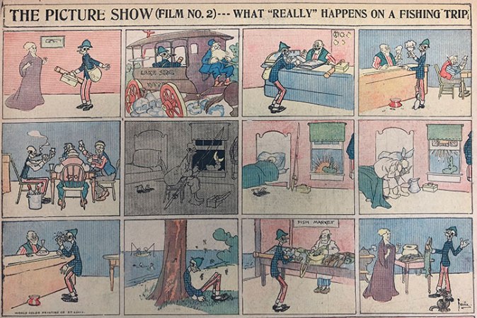 But Frink’s strips were at times literally ready to be animated. His 1910 strip The Picture Show places its cartooned figures, in spite of its papered medium, under the restrictions of silent film. In doing so, it imitates the animated film industry that was only just beginning to institutionalize itself. Like storyboards, these comic strips told one-off stories in gradually unfolding motion, capturing twelve-equally sized moments from a progressing chaotic action. These strips are titled as numbered films and in “Film No. 2 – What ‘Really’ Happens On a Fishing Trip,”—a tall, spindly man who looks very much like Circus Solly (and, by extension, Frink) goes on a fishing trip, but doesn’t get around to much fishing. Instead, he buys beer, plays cards, and smokes with a group of men. He then spends an oddly silent moment alone in the dark with his fishing pole before turning in for the night. He is barefoot as he cradles the fishing pole, wearing a somewhat comically oversized jacket for pajamas, and his clothes from the previous panel are hung up on the wall. He never gets around to any real fishing—a store-bought fish is enough to please his wife, and she is none the wiser.
