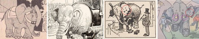 Cartoon elephants by (from left to right), George MacManus, Rube Goldberg, a strip signed by Frink, and Lucy and Sophie Say Goodbye. Notice the details of torn ears and tusk caps on Frink’s pachyderms.