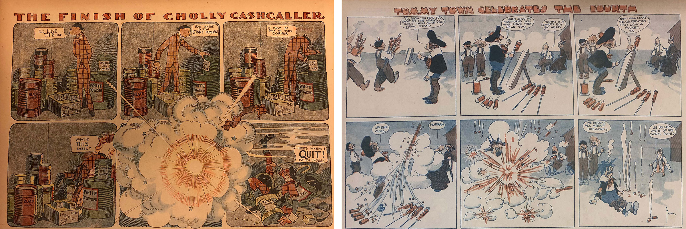 Frink’s cartooning provides wild insight into his counter-jumping days with his cartoon doppelgänger Cholly Cashcaller, a thinly-veiled younger Frink who can’t ever seem to do right by the fussy, high-society women who are his customers and their impatient husbands. The final comics strip from February 26th, 1905 sees poor Cholly blowing himself up in a storehouse full of fireworks—a gag that Frink would reuse, twice, (format and visuals alike) in his (signed) Tommy Town and Ratty & Algy strips in a few months’ time. The visceral image of an explosion waiting to happen was perhaps the most appropriate visual with which a cartoonist might explore the presumed fate of a queer man at the turn of the 20th century. It was a fate that Cholly shared with the dandy “Dippy Dude” twosome Wobbie and Weggie, a thinly-veiled parody of a gay couple with faux-European affectations created by a cartoonist who only signed the strip “Lester.” The “dippy dudes” said their last “bah-jove!” after they blew themselves up on February 24th, 1906. That one of Wobbie and Weggie’s many catchphrases was “blow me!” certainly compels the curious mind to inference-making. Fittingly, the even more scandalous life of the queer women of Lucy and Sophie Say Goodbye was marked out in the cartoons by a series of nearly weekly explosions.