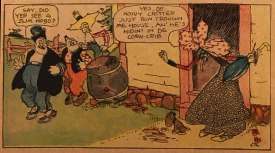 The only pursuer who is ever able to give Solly even a little bit of trouble is his estranged wife. Solly’s acrobatic shenanigans are the only thing standing in between him and a traditional domestic life of raising three children with his wife. Frink introduces the burly washerwoman “Mrs. Solly” in a September 22nd, 1905, strip in which the shiftless rascal is shocked to discover he is the father of a “long-deserted family” when he makes a rare trip to Mrs. Solly to ask for money. The commanding washerwoman, however, has had enough of Solly’s wandering, shouting: “now after all these years I’ve got yer!” Mrs. Solly berates her husband—his wandering ways are fundamentally incompatible with their marriage—and manages to trap him at home. On the 25th, when the Grassville Force attempts to extract Solly from his domestic imprisonment, Solly voluntarily surrenders, preferring jail to life with his wife. Nevertheless, the Force’s attempt fails.