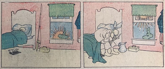 Solly spends several more strips trying to escape—Mrs. Solly bans him from leaving their house, monitors him with her three children as sentinels, and finds a use for his acrobatic stunts in doing housework (like the “fluttering fairy” in the September 29th strip). When Solly finally makes his escape, it’s by disappearing into a “moving picture,” tricking his family into thinking their living room window has been placed next to a moving picture screen. Solly’s disappearing silhouette on the “moving picture screen” of a window is identical to his silhouette on an illustrated poster next to the window for one of his old acrobat shows. It is only by fading away from the more “realistic” world of straight marriage, into the world of the dynamic image, that Frink’s cartoon doppelgänger is able to return to the endless play or pursuit between men that makes up his daily routine.