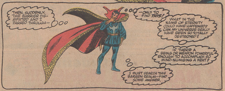 In it, Doctor Strange returns to his “native dimension” after being very suddenly and unwillingly bumped out of it and finding a strange cosmic barrier barring his re-entry. When the bubble finally disperses after a few days of Strange’s fruitless effort to pierce it, Strange—sporting the five o’clock shadow that is superhero comic code for working for days without rest—finds his homeworld gone. Not just Earth, but everything. The entire universe.