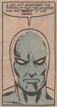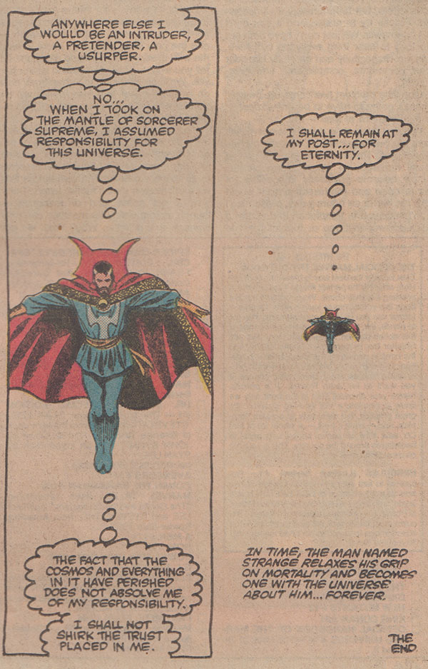 Let’s put it this way: these three are so powerful they are about to project that power through the Ultimate Nullifier to recreate the universe as it was by “nullifying the nothingness” when the ghost of Eternity appears to them to ask them to let the universe die in peace. Accepting that the Marvel Universe should be allowed to die with dignity (something that was way past possible in 1982 and beyond impossible in 2022—“dignity” is the last word I’d used to describe anything about superhero comics), the Silver Surfer leaves to explore the multiverse, while Phoenix decides to seek out a reality where she, not the universe, died and take her old place (an explanation for her return that strikes me as better than the one written for her in Fantastic Four vol. 1, #286 to set-up her joining the cast of X-Factor in 1986). Stephen Strange, however, chooses to stay behind. Deciding that he would only be “an intruder, a pretender, a usurper” should he travel to another reality, Strange demonstrates a humility and sense of duty that is unlike the arrogant and excuse-making magician I am used to from reading the Defenders comics of the 70s and 80s. He thinks to himself, “When I took on the mantle of sorcerer supreme, I assumed responsibility for this universe. The fact that the cosmos and everything in it have perished does not absolve me of my responsibility…I shall remain at my post…for eternity.” The narration describes him eventually “relaxing his grip on mortality” and becoming “one with the universe about him.”