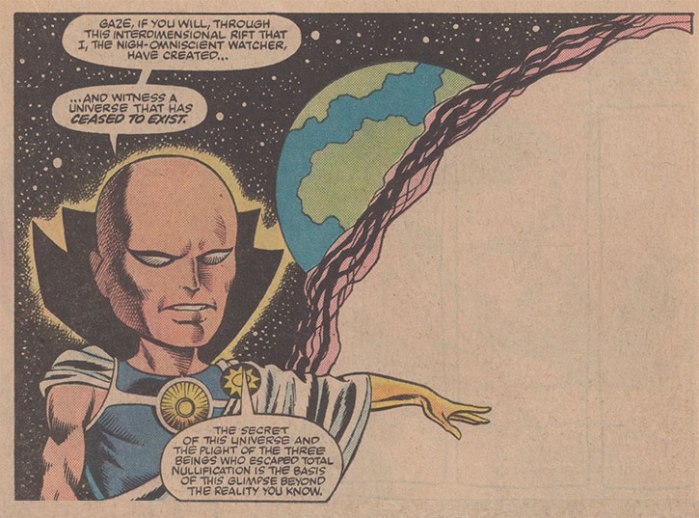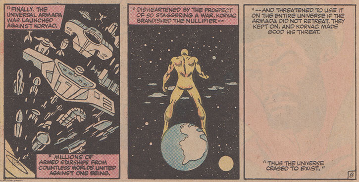 The details of the backstory aren’t that important. Korvac of the infamous “Korvac Saga” from Avengers vol. #s 167, 168, 170–177 (1978) ended up winning in this reality—much like he did in What If? #32 (January 1982), entitled “What if the Avengers had become Pawns of Korvac?”— and in this version he uses the Ultimate Nullifier when a “Universal Armada,” made up of space navies of countless worlds, comes after him and refuses to stand down when threatened with the Nullifier. For some reason that is not really explained and that comes off as a writerly convenience so that this story can even exist, Korvac shunted Doctor Strange, Silver Surfer, and Phoenix out of that reality before taking it over because “their power was not worth absorbing.” I mean, that makes absolutely no sense given how powerful the three are, but again, it is kind of beside the point.